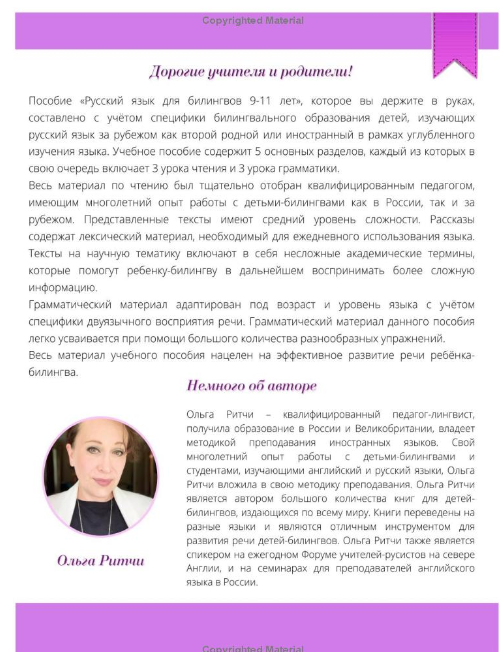 Весь материал учебника был тщательно отобран квалифицированным педагогом, имеющим многолетний опыт работы с детьми-билингвами как в России, так и за рубежом. Представленные тексты имеют средний уровень сложности. Рассказы содержат лексический материал, необходимый для ежедневного использования языка. Тексты на научную тематику включают в себя несложные академические термины, которые помогут ребенку-билингву в дальнейшем воспринимать более сложную информацию.