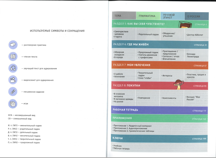 Данный учебник адресован иностранным студентам, владеющим русским языком на уровне pre-intermediate. Материалы данного комплекта книг способствуют развитию навыков устной и письменной речи, а также аудирования и чтения текстов в рамках Базового уровня владения русским языком. Вторая часть (А 2.2) комплекта содержит 4 раздела: "Как ты себя чувствуешь?", "Где мы живем", "Мои увлечения", "Покупки", а также последующие грамматические темы.
