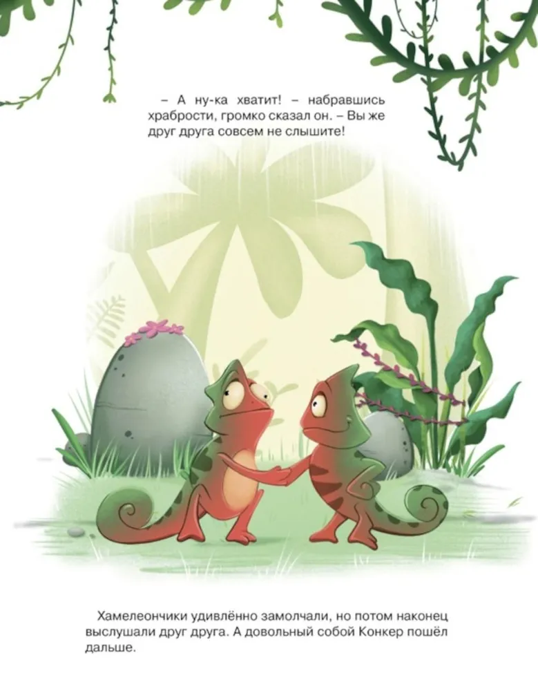 Khameleon Konker s rozhdenija byl pokhozh na drugikh malyshej: jazyk-lipuchka i khvost-zavitushka. No odnazhdy on zametil, chto ne menjaet tsvet. A imenno po tsvetu khameleony privykli opredeljat nastroenie. No vneshnost byvaet obmanchiva. Kak nauchitsja vyrazhat svoi chuvstva? Knigi Khanny Pekkhem - eto vozmozhnost v igrovoj forme razvit emotsionalnyj intellekt i pogovorit s rebjonkom o chuvstvakh i perezhivanijakh na ponjatnom emu jazyke. Prostaja i jarkaja istorija s vesjolymi zadanijami dlja samorazvitija pomozhet objasnit malyshu, pochemu vazhno byt soboj.