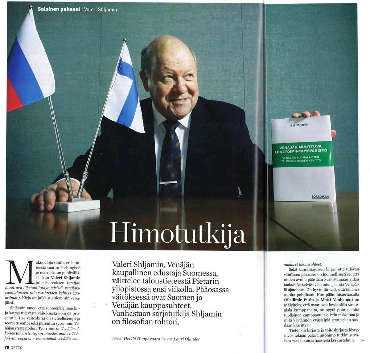 Todellinen venalais-suomalaisten taloussuhteiden asiantuntija Valery A. Shlyamin on kirjassaan asiantuntevasti vertaillut Venajan ja Suomen liiketoimintaymparistoa. Han kasittelee aihetta oman vahvan kokemuksensa pohjalta ja esittaa teoksessa oman nakemyksensa maiden taloudellisen kumppanuuden kehityssuunnista ja -muodoista seka valtioiden roolista olosuhteiden luomisessa maiden valisen liiketoimintaverkoston laajentamiseksi. Teoksessa erityisen ansiokasta on uusien mahdollisuuksien esille tuominen yhteisen liiketoimintaympariston ja yhteistyon kehittamiseksi.